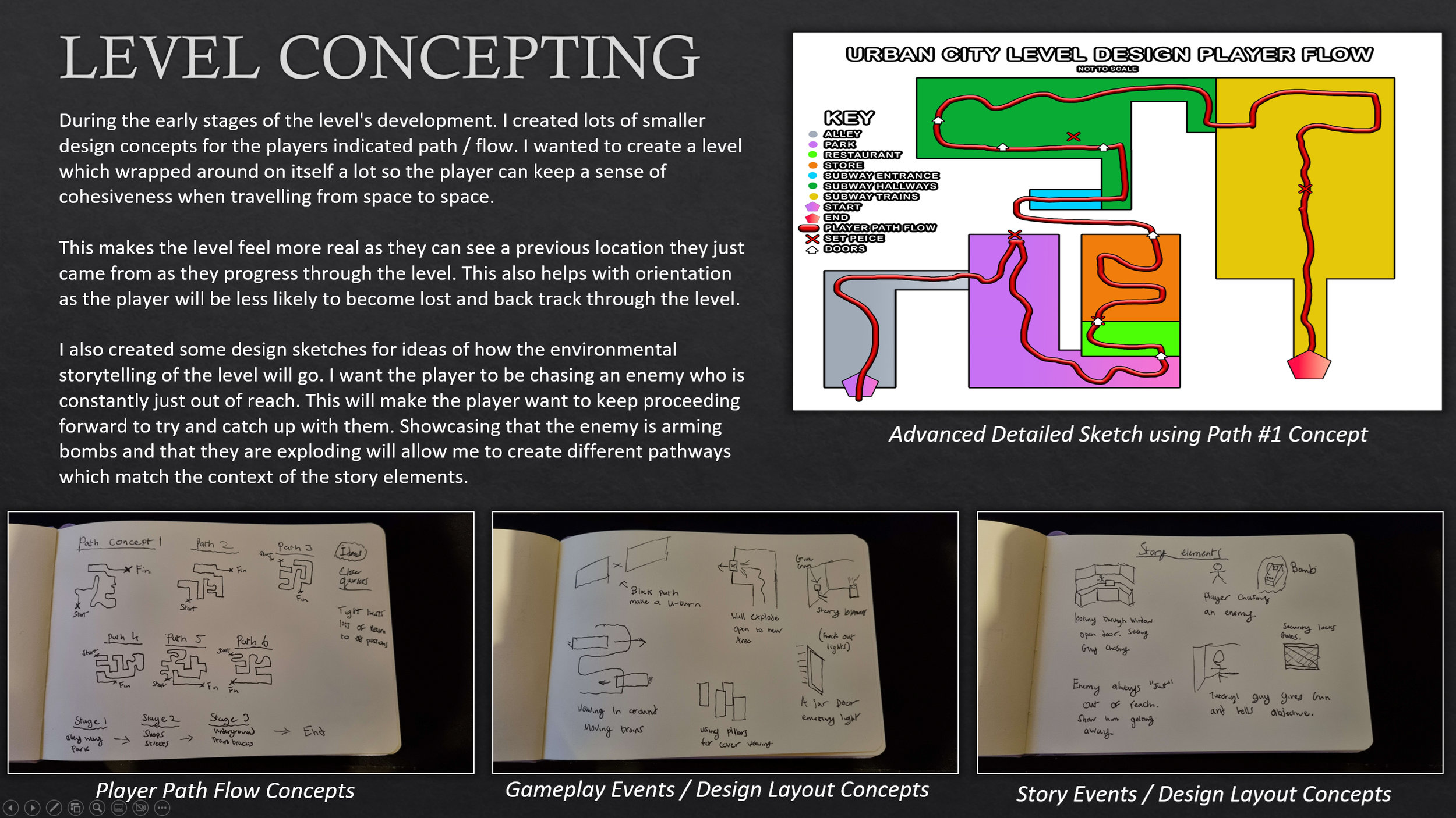 This level design project is focused on using urban spatial design to help influence how the player will navigate from space to space & thier decision making within these spaces. The gameplay design uses intense gun fights within these tight spaces to make the player push forward whilst navigating the space looking for thier next point of cover.